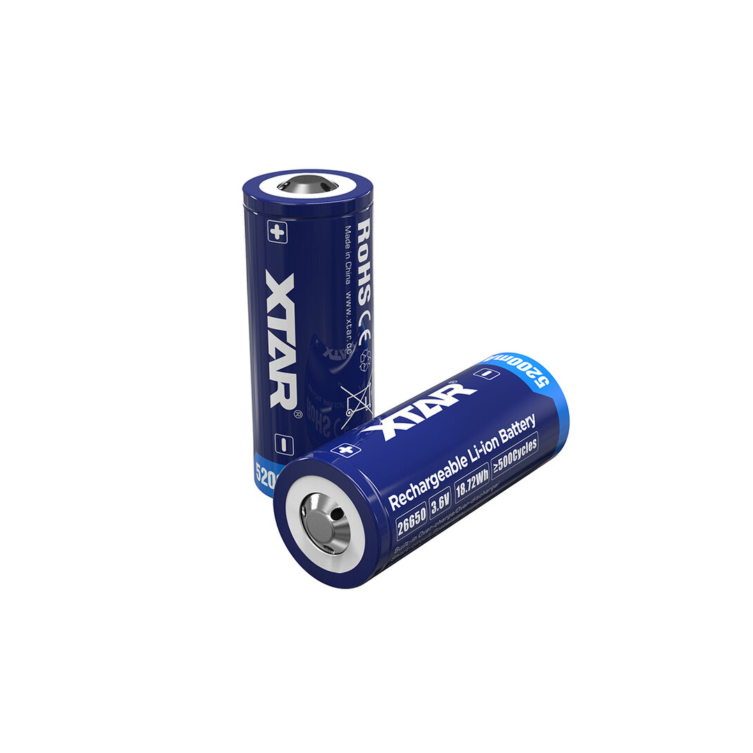 Batterie Li-ion Xtar 26650 d'une capacité de 5200 mAh. Protégé contre les surcharges, les décharges excessives, les surcharges et les courts-circuits.